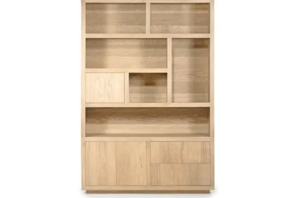Het kabinet heeft open vakken in diverse formaten en is voorzien van drie deuren en twee lades. Deze indeling biedt ruimte voor servies accessoires of andere spullen. Het kabinet maakt deel uit van een met bijpassende meubels.