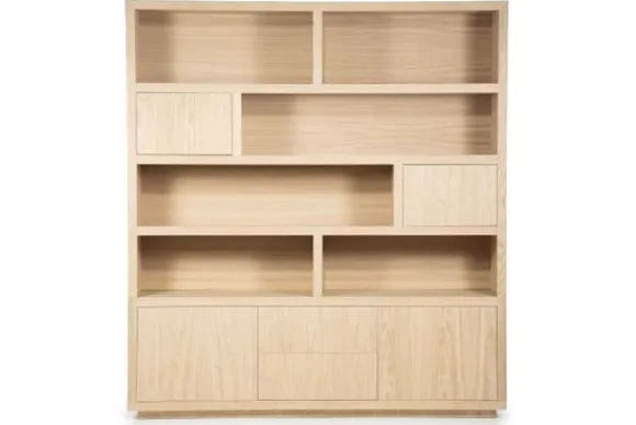 Het kabinet heeft open vakken in diverse formaten en is voorzien van vier deuren en twee lades. Deze indeling biedt veel ruimte voor servies accessoires of andere spullen. Het kabinet maakt deel uit van een met bijpassende meubels.