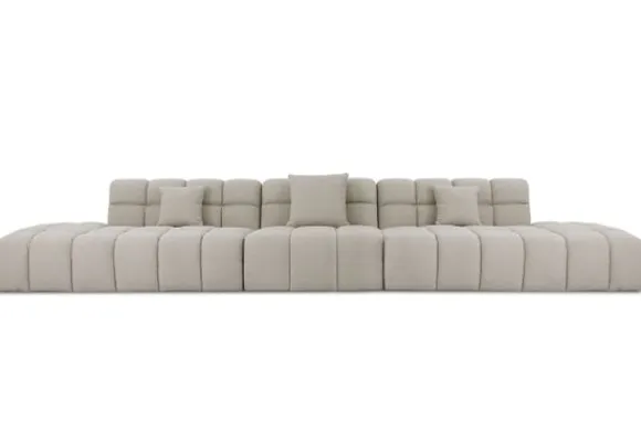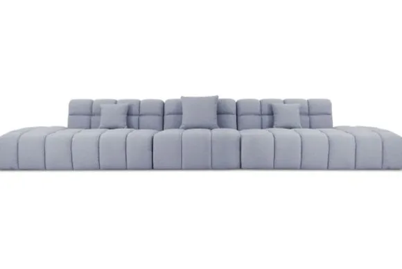 Bankstel Trentino van het merk Moderno is een bank met geblokte zit- en rugkussens en een zitting die doorloopt tot net boven de grond.