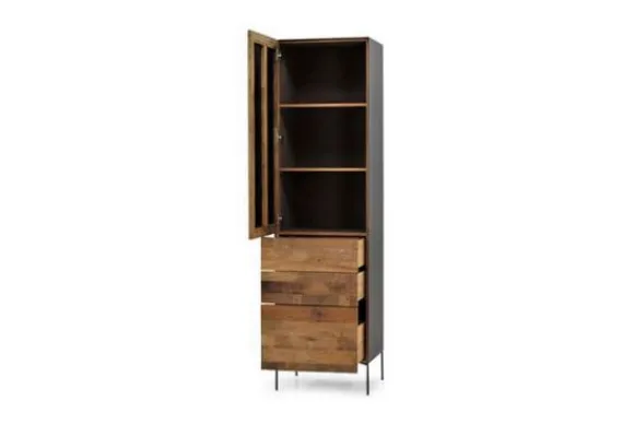 Bergkast Pandora MX 0015 van het merk Tower Living is vervaardigd uit metaal en gerecycled teakhout. Het hout is hergebruikt, hierdoor is ieder meubel uniek. Er zijn bij ieder meubel andere stukken hout gebruikt. Deze kunnen wat lichter of donkerder van kleur zijn, maar ook wat grover of robuuster van structuur. Dit is de charme van een natuurproduct. De kast gaat naar links open.