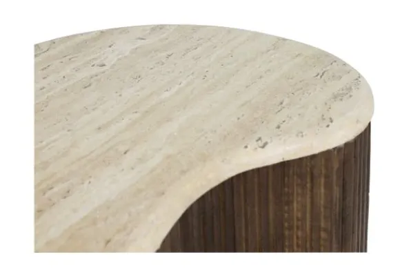 De basis van de tafel is gemaakt van mango hout, bekend om zijn duurzaamheid en mooie, warme uitstraling. Het hout is verticaal geribbeld, wat zorgt voor een mooie textuur en een speelse interactie tussen het strakke travertin en het natuurlijke hout. Deze tafel is perfect voor liefhebbers van natuurlijke materialen en organische vormen, en zal zeker een blikvanger zijn in elke woonkamer.