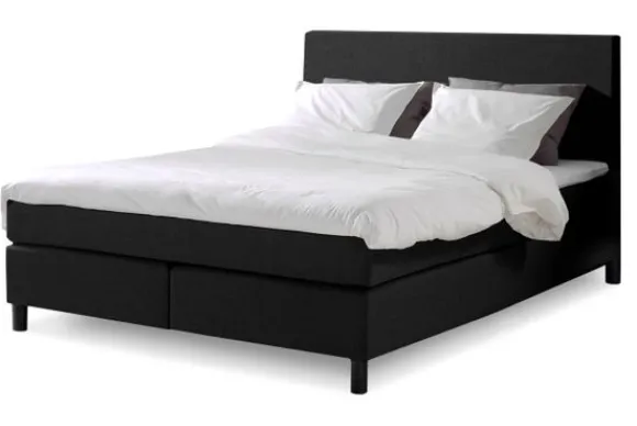 De boxspring heeft een strakke vormgeving en is gestoffeerd met de stof Hugo in de kleur zwart. Omdat de boxspring alleen leverbaar is in deze kleur, is de boxspring snel leverbaar.