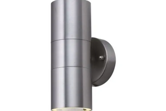 Buitenlamp Metro 5008-2-LED van het merk Searchlight is verkrijgbaar in diverse uitvoeringen. Dit zilverkleurige spotje staat goed op elke buitenmuur.