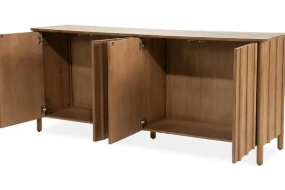 Het dressoir is voorzien van vier deuren zonder grepen. Achter de deuren bevinden zich ruime legplanken die veel opbergruimte bieden voor servies glaswerk of woonaccessoires. Dit dressoir maakt deel uit van een met bijpassende meubels.