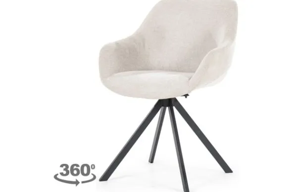 Eetkamerstoel Mamé beige Houston 95840 van het merk Eleonora is beschikbaar in drie verschillende kleuren: beige, bruin en grijs. Deze stoel is bekleed met een stof die je kunt schoonmaken met de stofzuiger. Deze stoel is door de zwart metalen stervoet 360 graden draaibaar. De rugleuning van de stoel loopt in een vloeiende beweging over tot armleuningen.