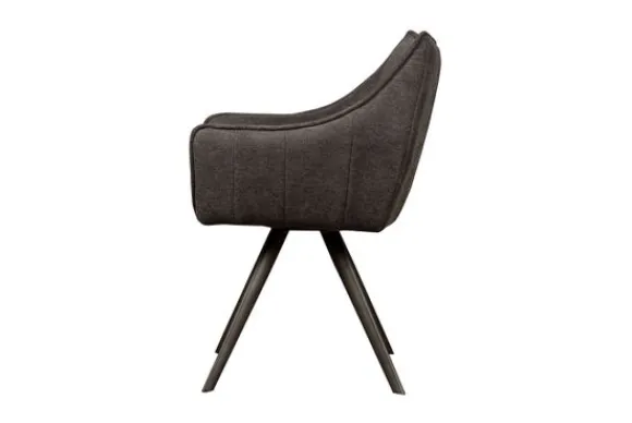 Eetkamerstoel Riviera AI 0122 Dark Grey van het merk Tower Living is beschikbaar in drie kleuren stof: donkergrijs, grijs en lichtgrijs. De Riviera is voorzien van zwart metalen poten en heeft armleuningen. De kuip is afgewerkt met geknepen naden. In de achterkant van de rugleuning zitten verticale stiksels. Deze stoel is 180 graden draaibaar en is voorzien van een terugdraaisysteem. Door het terugdraaisysteem kun je de zitting van de stoel draaien en daarna zal deze uit zichzelf weer terug draaien naar het midden.