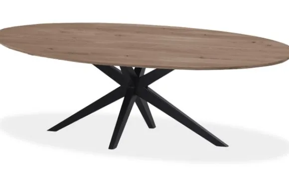Het robuuste onderstel met zwarte metalen spinpoten biedt niet alleen stabiliteit, maar voegt ook een modern en industrieel accent toe. Deze combinatie van materialen maakt de tafel perfect voor zowel een eigentijdse als een stoere inrichting.