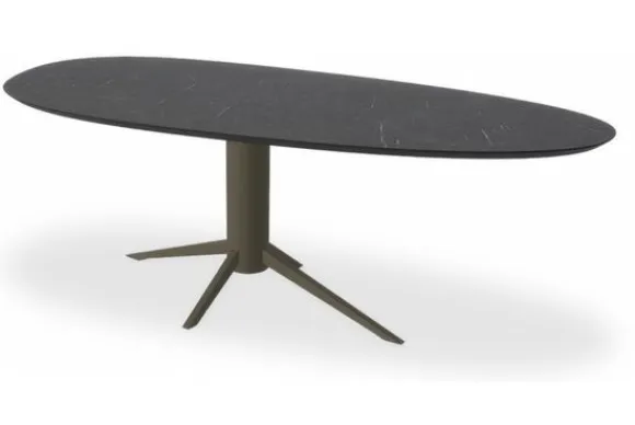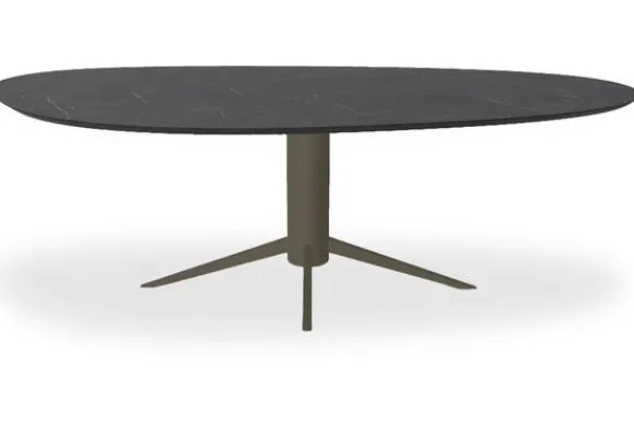 Eettafel Nuvio van het merk Every Table BV heeft een kiezelvormig HPL blad van 2,8 centimeter dik. Het blad is verkrijgbaar in verschillende maten en wordt standaard geleverd met een tapse rand.