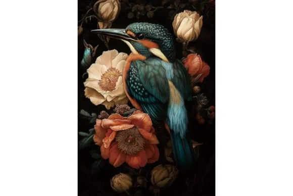 Glasschilderij IJsvogel 080120-1137 van het merk Ter Halle toont een kleurrijke ijsvogel met bloemen.