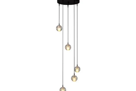 Hanglamp 2122-05-173-35-5 Bubbles van het merk Masterlight is een eenvoudige maar luxe lamp door de glazen lampenkap waarin luchtbellen zichtbaar zijn. De hanglamp heeft vijf transparante bubbellampenkappen met een diameter van 10 centimeter die zigzag onder elkaar hangen. De bubbellampenkappen zijn in de hoogte verstelbaar tot een maximale lengte van 200 centimeter. De lampenkap heeft aan de binnenkant een bulletvormige lichtbron wat voor een prachtig effect zorgt. Hang de hanglamp boven je eettafel, salontafel of in de hal… De lichtbron is inclusief bij deze lamp en is dimbaar met een externe dimmer.