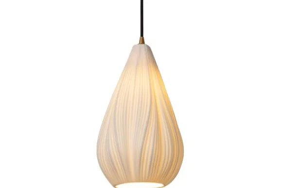 De hanglampen hebben een speelse doorstraling door het golvend reliëf op de porseleinen lampenkap. De aanpasbare stoffen snoeren van de lampen zit mooi verwerkt in de ronde metalen bevestigingsplaat.
