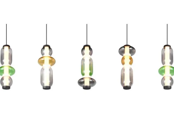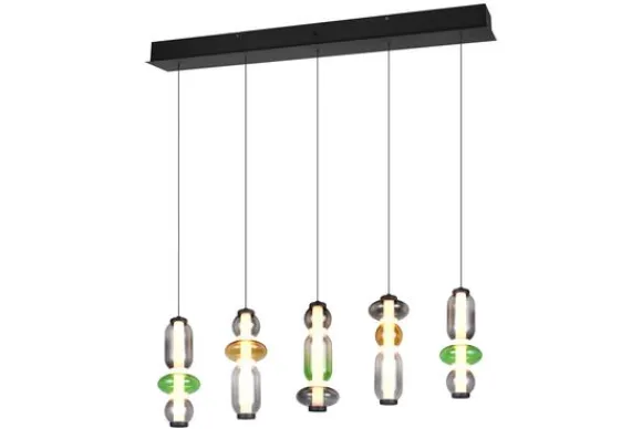Hanglamp Minerva 334310517 van het merk Trio Lighting is een moderne hanglamp met meerdere glazen elementen in verschillende kleuren. De combinatie van glas en een strakke metalen plafondplaat geeft de lamp een eigentijdse uitstraling die mooi past boven een eettafel of kookeiland.