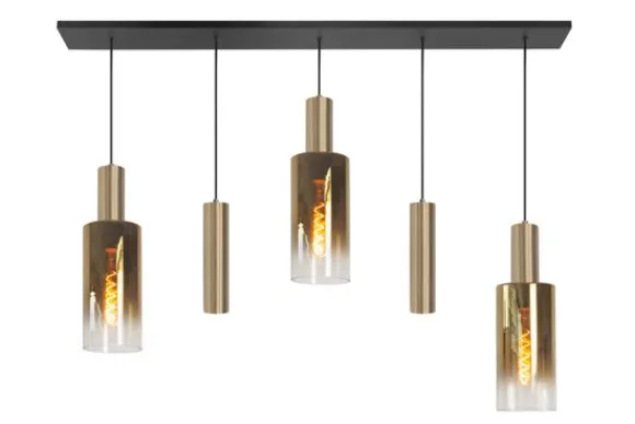 Dankzij de goud gekleurde glazen kappen en het strakke zwarte armatuur en bevestigingsplaat past hanglamp Perugia perfect in een modern of hotel chic interieur. Deze lamp wordt geleverd zonder lichtbronnen.