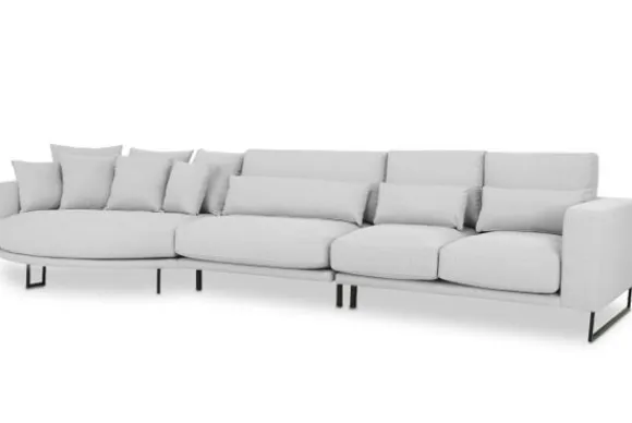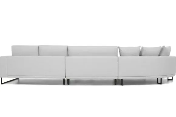Loungebank Dordoni II van het merk Be Inspired is verkrijgbaar in alle kleuren. Tevens is de bank leverbaar in materiaalsoorten zoals ribstof, teddy en velvet. Je kunt kiezen uit diverse afmetingen. De Dordoni II bank wordt standaard uitgevoerd met alle sierkussens en lendekussens die ook op de foto te zien zijn. De rugkussens daar achter zijn lekker hoog, deze combinatie zorgt voor een goede ondersteuning van de rug. Alle rugkussens zitten los en zijn omkeerbaar, de zitkussens zitten vast met klittenband. Het unieke aan de Dordoni II is het ronde loungegedeelte. Je kunt hier lekker wegkruipen tussen alle sierkussens. Deze bank oogt ruimtelijk door de hoge metalen sledepoten.
