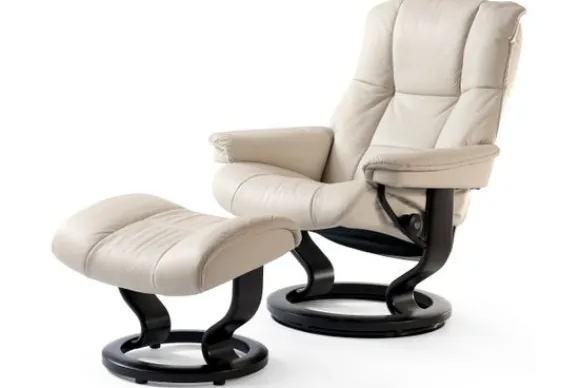 Relaxfauteuil Mayfair Classic van het merk Stressless is verkrijgbaar in alle kleuren. Tevens is de fauteuil leverbaar in stof en rundleder. Je kunt bij deze fauteuil kiezen uit diverse maten zoals Small, Medium en Large. Deze fauteuil heeft een Plus en Glide Systeem: Aan beide zijden van de fauteuil zit een knop waarmee je de weerstand van de stoel kan aanpassen naar eigen behoefte. Door de knoppen in tegengestelde richting te draaien stel je jouw ideale relaxpositie samen. Op die manier krijgt de nek en de onderrug goede onderstuening. Door de rugleuning naar voren te buigen activeer je de slaapfunctie. Op het moment dan je weer rechtop komt stelt de stoel zichzelf weer bij naar de normale stand.