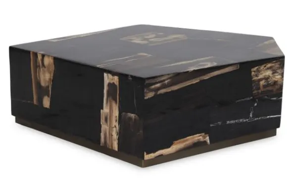 Salontafel Rayn Petrified Wood Large 706817 van het merk PTMD is een prachtige, luxe salontafel. De tafel is gemêleerd zwart met bruin/ crème met een glanzende afwerking door de polyesterhars topcoat. Het tafelblad heeft een hoogte van 31 cm en is gemaakt van gelamineerd versteend hout. Het materiaal van het onderstel is RVS met messing afgewerkt.