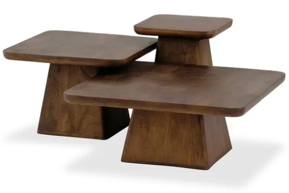 Salontafelset Stockholm is vervaardigd uit massief mangohout, een houtsoort die bekendstaat om zijn duurzaamheid en karakter. Het blad loopt taps af naar beneden en rust op een kegelvormige poot, wat de set een elegante en tijdloze uitstraling geeft.