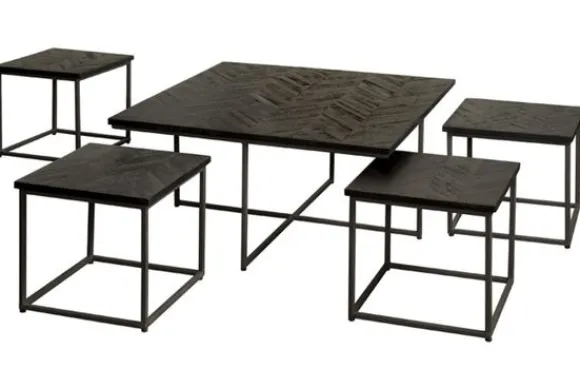 Salontafelset Via SI 0020B is een set van vijf salontafels. Deze tafels hebben verschillende afmetingen. De grootste tafel heeft een afmeting van 90 x 90 x 45 cm en de kleine tafels hebben een afmeting van 40 x 40 x 40 cm. De tafels hebben een uniek uiterlijk, doordat de tafels gemaakt zijn van gerecycled teak hout. Het houten blad heeft een speels visgraat motief en de poten van de tafels zijn van stoer metaal gemaakt. Hierdoor zijn het ideale tafels voor een industrieel interieur. Plaats de tafels in je gehele interieur, bijvoorbeeld een kleine tafel naast de bank met een leuke plant erop.