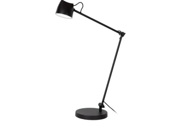 Het vaste ontwerp met de schuin oplopende metalen arm zorgt voor een speels en grafisch silhouet, terwijl de matzwarte afwerking een verfijnde, moderne uitstraling geeft. Perfect geschikt voor op een bureau, nachtkastje of side table binnen een eigentijds of industrieel interieur. Compact van formaat, groots in karakter.