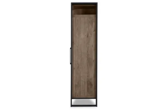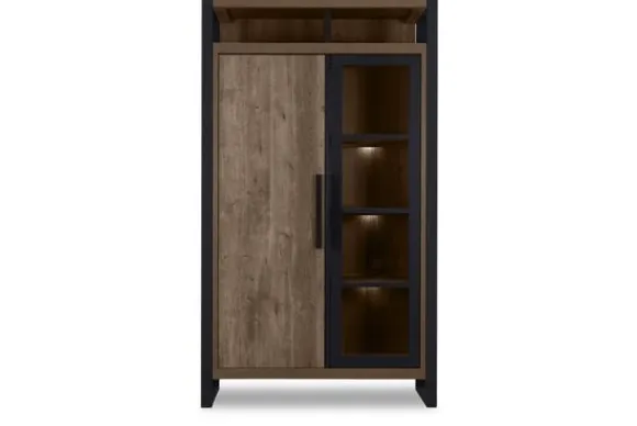 De kast biedt diverse opbergmogelijkheden. Bovenin bevinden zich twee open vakken. Daaronder vind je één gesloten deur met planken erachter en daarnaast één deur met glas, eveneens met planken erachter. De langwerpige zwarte metalen handgrepen geven de kast een moderne uitstraling. Alle deuren zijn voorzien van soft-close dempers, zodat alles geruisloos sluit.