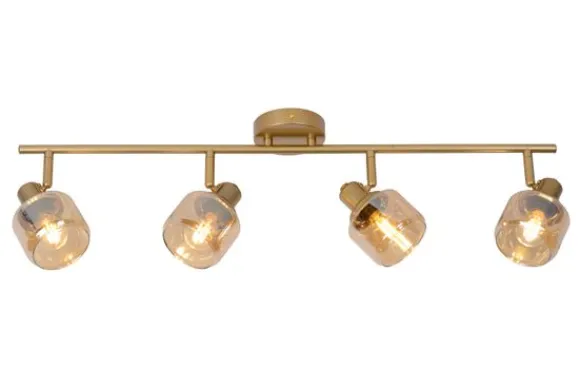 Plafondlamp Bjorn van het merk Lucide met vier spots is een krachtige mix van design en functionaliteit. De langwerpige, goudkleurige metalen balk vormt een stijlvol platform voor vier draaibare en kantelbare spots, elk voorzien van een warme amberkleurige glazen kap.