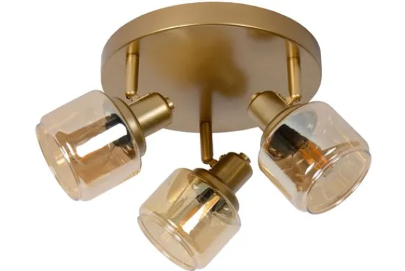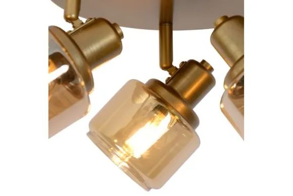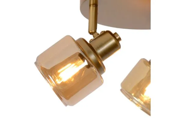 Plafondlamp Bjorn van het merk Lucide met drie spots combineert een elegante uitstraling met maximale functionaliteit. De ronde plafondplaat in goudkleurig metaal vormt een harmonieuze basis voor de drie draaibare en kantelbare spots, elk voorzien van een warm amberkleurig glazen kapje.