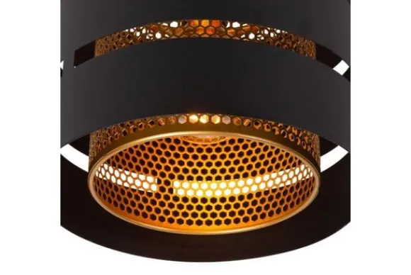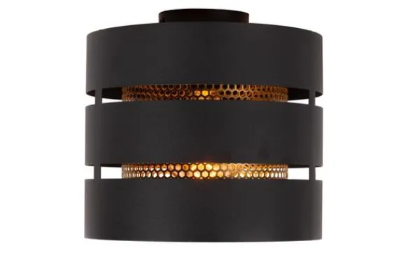Plafondlamp Rosas van het merk Lucide is een compacte krachtpatser met een luxe uitstraling. Het robuuste metalen design krijgt extra karakter door de goudkleurige honingraatstructuur aan de binnenzijde, die zorgt voor een warme en sfeervolle lichtval.