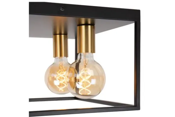 Plafondlamp Ruben van het merk Lucide is een stijlvolle mix van strakke lijnen en industriële elegantie. De open metalen frameconstructie geeft de lamp een ruimtelijk en grafisch karakter, terwijl de combinatie van matzwart met goudkleurige fittingen zorgt voor een luxe uitstraling.