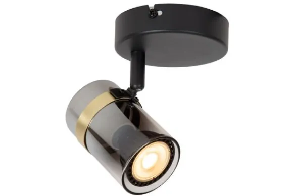 Plafondspot Upton van het merk Lucide is een compacte krachtpatser met een luxueuze uitstraling. De ronde plafondplaat in matzwart vormt een subtiele basis voor de opvallende spot in gerookt glas, stijlvol omlijst met een messingkleurige ring. Het resultaat is een elegante mix van modern design en warme accenten.