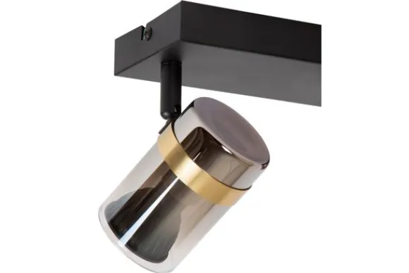 Plafondlamp Upton van het merk Lucide is een verfijnde spotlight met een krachtige uitstraling. De combinatie van een matzwarte basis met twee draaibare spots in gerookt glas en een gouden messing accent creëert een spannend contrast tussen stoer en chic. Het resultaat is een luxueuze plafondlamp die zowel functioneel als stijlvol is.