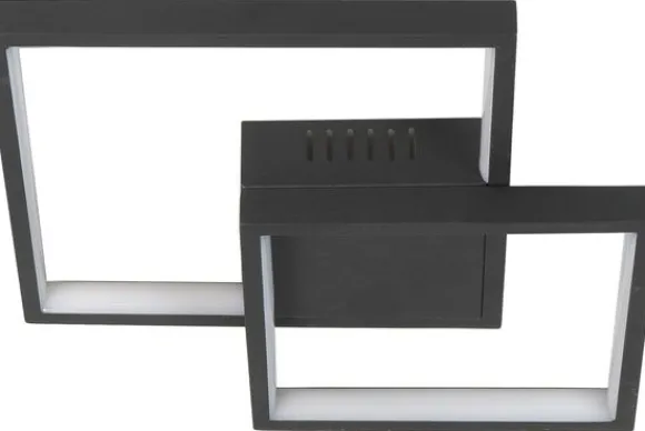 Plafondlamp Piazza van het merk Highlight bestaat uit twee vierkanten die gedeeltelijk over elkaar heen vallen. In de zwarte vierkanten zit een LED-strip verwerkt met een gelijkmatige, warme lichtverdeling. De lamp heeft een schakelaar met drie standen waarmee je de lichtsterkte van de lamp kunt regelen.