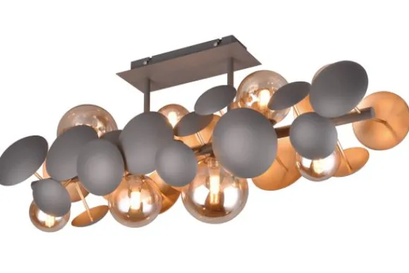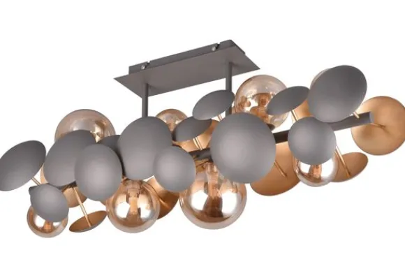 Plafondlamp Bubble van het merk Trio Lighting geeft een wow-effect, dankzij het bijzondere ontwerp. Het ontwerp van de lamp is een materialencombinatie van amberkleurig glas en antraciet- en goudkleurig metaal. Deze lamp heeft een mooi lichteffect met licht en schaduw door het ontwerp. Laat hem schitteren boven je eettafel. Deze lamp is exclusief de acht lichtbronnen met een G9 fitting. Voeg deze eenvoudig aan je winkelwagen toe wanneer je de plafondlamp toevoegd aan je winkelwagen.