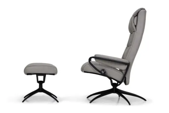 Relaxfauteuil London Highback van het merk Stressless is verkrijgbaar in alle kleuren. Tevens is de fauteuil leverbaar in stof en rundleder. Je kunt bij deze fauteuil kiezen uit diverse maten zoals Small, Medium en Large. Deze fauteuil heeft een Plus en Glide Systeem: Aan beide zijden van de fauteuil zit een knop waarmee je de weerstand van de stoel kan aanpassen naar eigen behoefte. Door de knoppen in tegengestelde richting te draaien stel je jouw ideale relaxpositie samen. Op die manier krijgt de nek en de onderrug goede ondersteuning. Door de rugleuning naar voren te buigen activeer je de slaapfunctie. Op het moment dan je weer rechtop komt stelt de stoel zichzelf weer bij naar de normale stand.