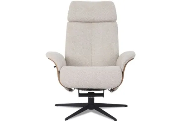 De stoel heeft stiksels in de rugleuning en naar buiten uitlopende armleuningen. Deze fauteuil wordt standaard uitgevoerd met een zwarte stervoet, armleuningen in de kleur nut oiled en exclusief de hocker. Je kunt dit aanpassen en bijbestellen onder ”Stel jouw relaxfauteuil samen”.