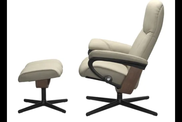 Relaxfauteuil Consul Cross van het merk Stressless is verkrijgbaar in alle kleuren. Tevens is de fauteuil leverbaar in stof en rundleder. Je kunt bij deze fauteuil kiezen uit diverse maten zoals Small, Medium en Large. Deze fauteuil heeft een Plus en Glide Systeem: Aan beide zijden van de fauteuil zit een knop waarmee je de weerstand van de stoel kan aanpassen naar eigen behoefte. Door de knoppen in tegengestelde richting te draaien stel je jouw ideale relaxpositie samen. Op die manier krijgt de nek en de onderrug goede onderstuening. Door de rugleuning naar voren te buigen activeer je de slaapfunctie. Op het moment dan je weer rechtop komt stelt de stoel zichzelf weer bij naar de normale stand.