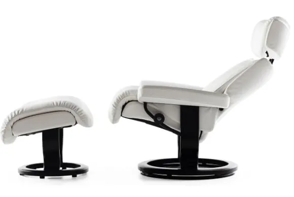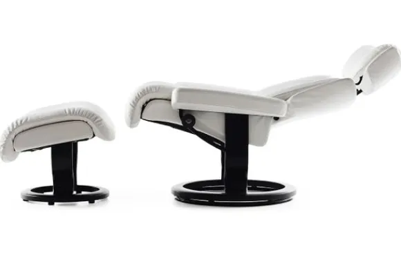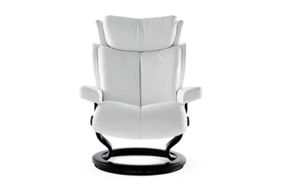 Relaxfauteuil Magic Classic van het merk Stressless is verkrijgbaar in alle kleuren. Tevens is de fauteuil leverbaar in stof en rundleder. Je kunt bij deze fauteuil kiezen uit diverse maten zoals Small, Medium en Large. Deze fauteuil heeft een Plus en Glide Systeem: Aan beide zijden van de fauteuil zit een knop waarmee je de weerstand van de stoel kan aanpassen naar eigen behoefte. Door de knoppen in tegengestelde richting te draaien stel je jouw ideale relaxpositie samen. Op die manier krijgt de nek en de onderrug goede onderstuening. Door de rugleuning naar voren te buigen activeer je de slaapfunctie. Op het moment dan je weer rechtop komt stelt de stoel zichzelf weer bij naar de normale stand.