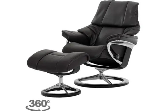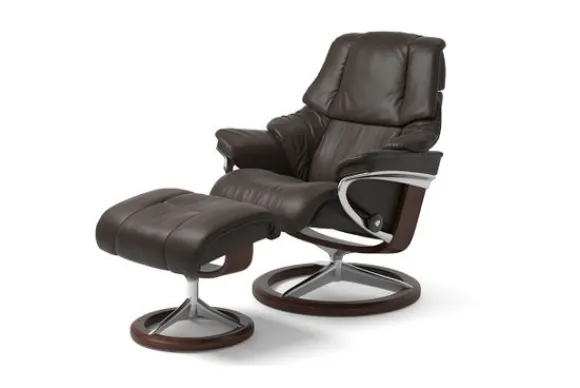 Relaxfauteuil Reno Signature van het merk Stressless is verkrijgbaar in alle kleuren. Tevens is de fauteuil leverbaar in stof en rundleder. Je kunt bij deze fauteuil kiezen uit diverse maten zoals Small, Medium en Large. Deze fauteuil heeft een Plus en Glide Systeem: Aan beide zijden van de fauteuil zit een knop waarmee je de weerstand van de stoel kan aanpassen naar eigen behoefte. Door de knoppen in tegengestelde richting te draaien stel je jouw ideale relaxpositie samen. Op die manier krijgt de nek en de onderrug goede onderstuening. Door de rugleuning naar voren te buigen activeer je de slaapfunctie. Op het moment dan je weer rechtop komt stelt de stoel zichzelf weer bij naar de normale stand.