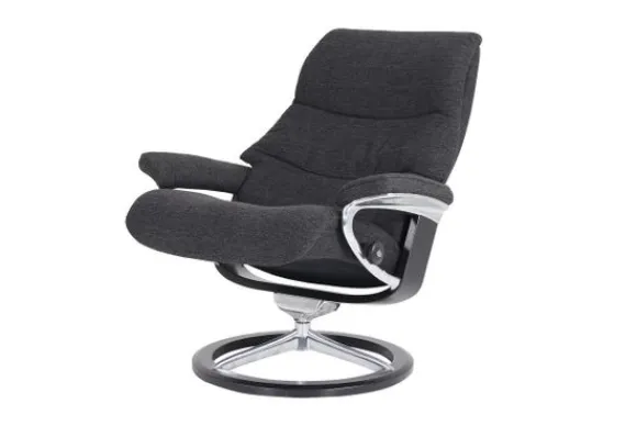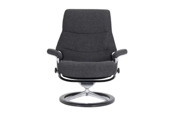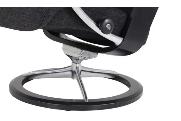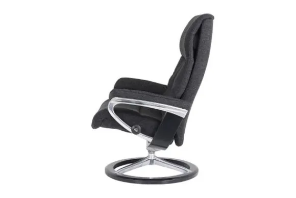 Relaxfauteuil View Signature van het merk Stressless is verkrijgbaar in meer dan 150 kleuren. Tevens is de fauteuil leverbaar in stof en rundleder. Je kunt bij deze fauteuil kiezen uit diverse maten zoals Small, Medium en Large. Deze fauteuil heeft een Plus en Glide Systeem: Aan beide zijden van de fauteuil zit een knop waarmee je de weerstand van de stoel kan aanpassen naar eigen behoefte. Door de knoppen in tegengestelde richting te draaien stel je jouw ideale relaxpositie samen. Op die manier krijgt de nek en de onderrug goede ondersteuning. Door de rugleuning naar voren te buigen activeer je de slaapfunctie. Op het moment dan je weer rechtop komt stelt de stoel zichzelf weer bij naar de normale stand.