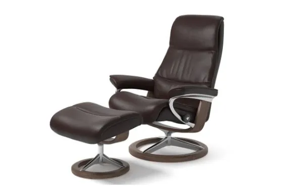 Relaxfauteuil View Signature van het merk Stressless is verkrijgbaar in meer dan 150 kleuren. Tevens is de fauteuil leverbaar in stof en rundleder. Je kunt bij deze fauteuil kiezen uit diverse maten zoals Small, Medium en Large. Deze fauteuil heeft een Plus en Glide Systeem: Aan beide zijden van de fauteuil zit een knop waarmee je de weerstand van de stoel kan aanpassen naar eigen behoefte. Door de knoppen in tegengestelde richting te draaien stel je jouw ideale relaxpositie samen. Op die manier krijgt de nek en de onderrug goede ondersteuning. Door de rugleuning naar voren te buigen activeer je de slaapfunctie. Op het moment dan je weer rechtop komt stelt de stoel zichzelf weer bij naar de normale stand.