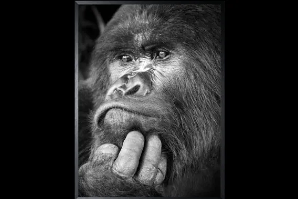 Art Print Gorilla ISF103 van het merk Luxe Framing Art is verkrijgbaar in verschillende afmetingen. Op deze zwart-witprint zie je een gorilla die bedachtzaam voor zich uitstaart. De achtergrond is zwart. Deze Art Print wordt standaard met een zwarte lijst geleverd.