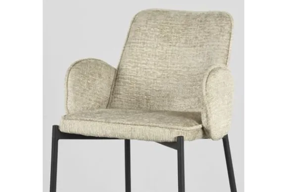 Barkruk Joni, uitgevoerd in desert elegance heeft een luxe ronde zitting, rugleuning en is in het bezit van armleuningen. Deze combinatie maakt Joni een luxe barkruk met ontzettend veel comfort. De armleuningen lopen achter de rugleuning langs waardoor de barkruk een uniek uiterlijk krijgt en er ook nog eens ontzettend leuk uitziet aan de achterkant. Dat is natuurlijk een fijne bijkomstigheid als de barkrukken aangeschoven staan aan tafel of een bar. Het ranke maar doorlopende zwarte frame waar de zitting als ware op rust geeft de barkruk een luchtige uitstraling. Het U-frame zorgt voor een makkelijke op- en afstap en dient als voetensteun. De uiteinde van het frame loopt op vier zijdes een klein stukje door wat zorgt voor een speels effect.