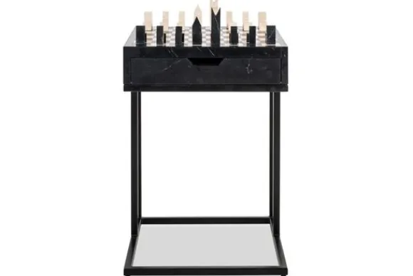 Gemaakt van hoogwaardig zwart marmer in combinatie met een strakke metalen onderstel, ademt deze bijzettafel een tijdloze allure. Het schaakbordpatroon is volledig geïntegreerd in het marmeren tafelblad en wordt aangevuld met abstract vormgegeven schaakstukken in zwart en wit marmer.