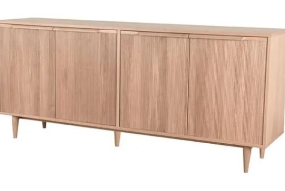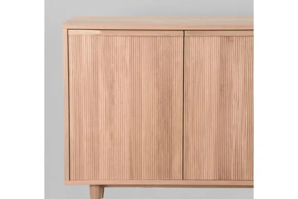 De fijne groeven op de deurtjes van het dressoir accentueren op een subtiele wijze het speelse karakter. Het dressoir is verdeeld door een vaste plank in twee delen die ieder door twee deurtjes worden afgesloten. De deurtjes zijn voorzien van een houten handgreepje aan de bovenzijde van de deur. De kegelvormige poten geven het geheel een luchtige uitstraling.