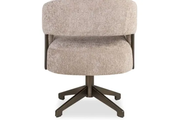 De eetkamerstoel is voorzien van een stevige, 360 graden draaibare poot in brons metaal. De combinatie van stof en hout past mooi binnen een modern of Japandi interieur.