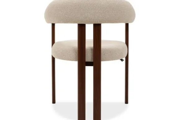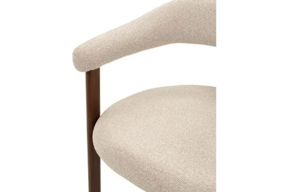 De walnut look metalen poten geven de stoel een warme en evenwichtige uitstraling. Het contrast tussen de zachte stof en het donkere onderstel benadrukt de zorgvuldige afwerking van het ontwerp.