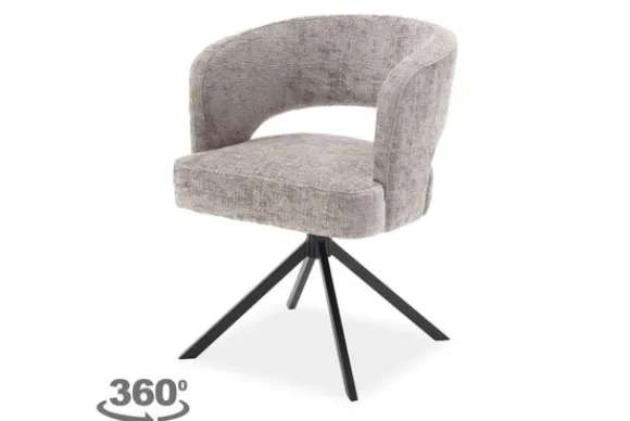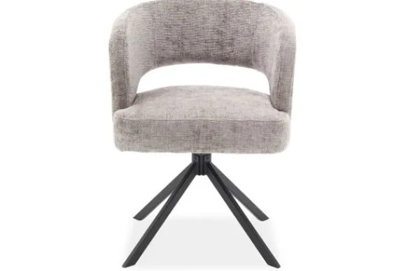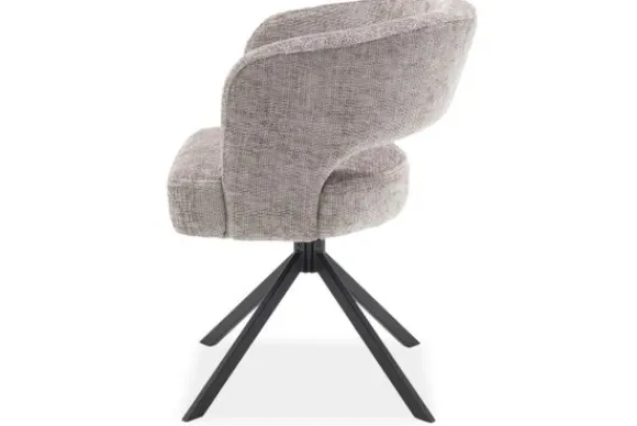De ruime kuipvorm zorgt voor prettig comfort tijdens lange tafelmomenten. De zachte stof voelt warm aan en geeft de stoel een rustige look. De zilveren tint brengt een helder accent in de ruimte zonder overheersend te worden.