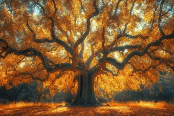 Glasschilderij Boom in de herfst 080120-1172 van het merk Ter Halle toont een boom. De zon die door de bladeren heen schijnt en de herfstige kleuren geven het schilderij een zachte en natuurlijke uitstraling.