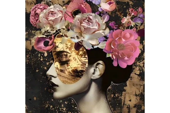 Glasschilderij Vrouw met goud en bloemen 080080-250-1 van het merk Ter Halle toont het zijaanzicht van een vrouw, die een gouden masker draagt en een kleurrijke bos bloemen op haar hoofd heeft.