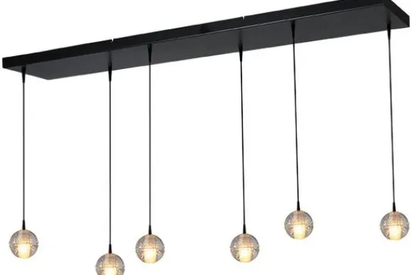 Hanglamp 2121-05-173-130-25-6 Bubbles van het merk Masterlight is een eenvoudige maar luxe lamp door de glazen lampenkap waarin luchtbellen zichtbaar zijn. De hanglamp heeft zes transparante bubbellampenkappen met een diameter van 10 centimeter en de lamp is in de hoogte verstelbaar tot een maximale lengte van 170 centimeter. De lampenkap heeft aan de binnenkant een bulletvormige lichtbron wat voor een prachtig effect zorgt. Hang de hanglamp boven je eettafel, salontafel of in de hal… De lichtbron is inclusief bij deze lamp en is dimbaar met een externe dimmer.