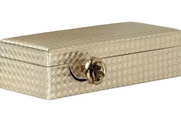 Juwelenbox Trace Klein 212101 van het merk Richmond Interiors is gemaakt van ijzer, MDF en rexine. Rexine is een vorm van kunstleder dat tegenwoordig nog gebruikt wordt voor het binden van lederen boeken en heeft de look van echt leer. Rexine is slijtvast en een antislipmateriaal. De juwelenbox is voorzien van een gewoven patroon en een gouden roos aan de voorkant waarmee je de box kan openen. De juwelenbox is ook verkrijgbaar in een groter formaat.